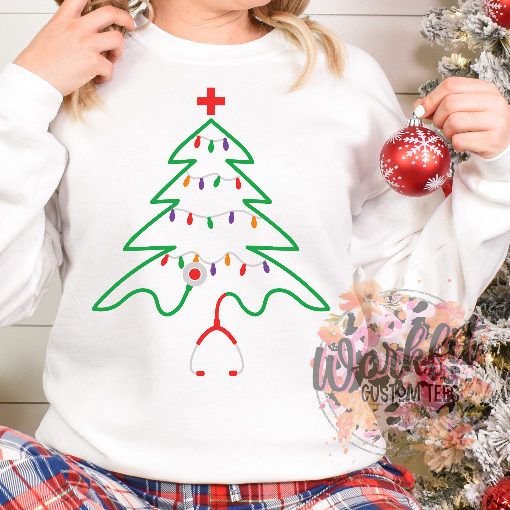 White Christmas Tree Crewneck- This design can be worn by any unit or department. Availble on a Classic White Unisex Gildan Crewneck.