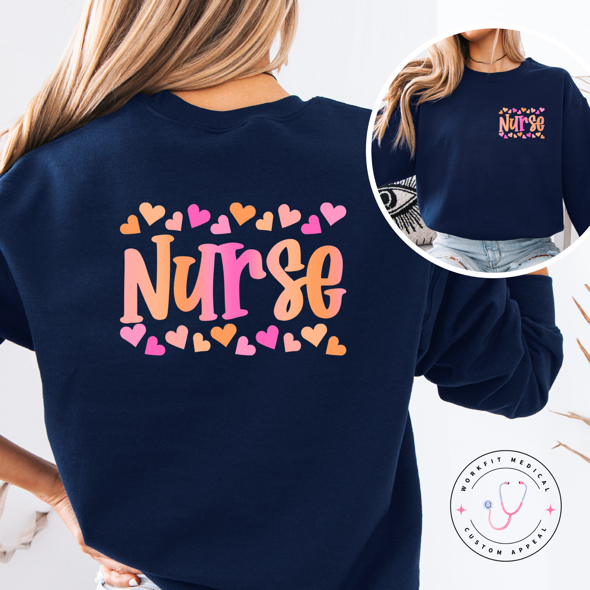 Double Designed Navy crewneck- full of color of pink & orange. I offer my custom design on a Gildan Brand sweater. Size chart below.