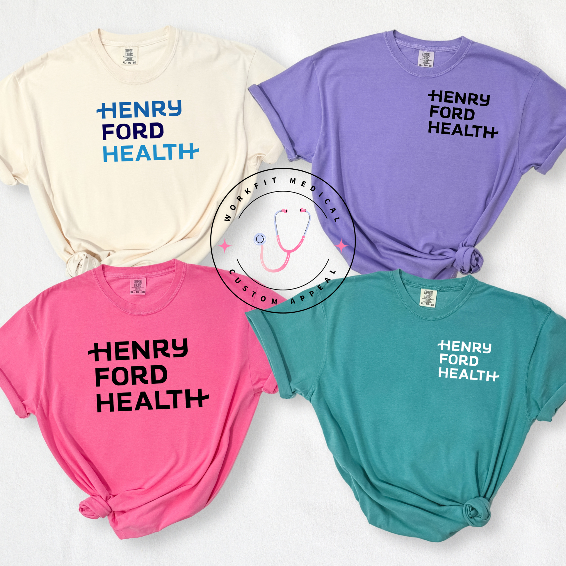 4 Comfort Color T-Shirts with Logo- DTF imagery for long lasting wear and care.