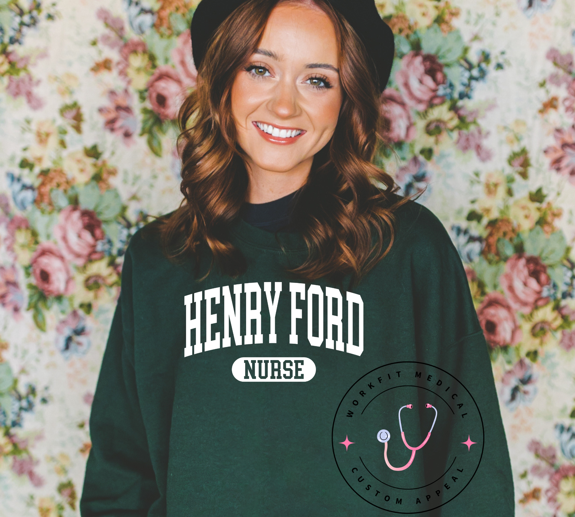 Varsity Crewneck- Henry Ford Logo- Offered on a Unisex Gildan Crew 50/50 cotton polyester. Lots of options, Size Chart below: