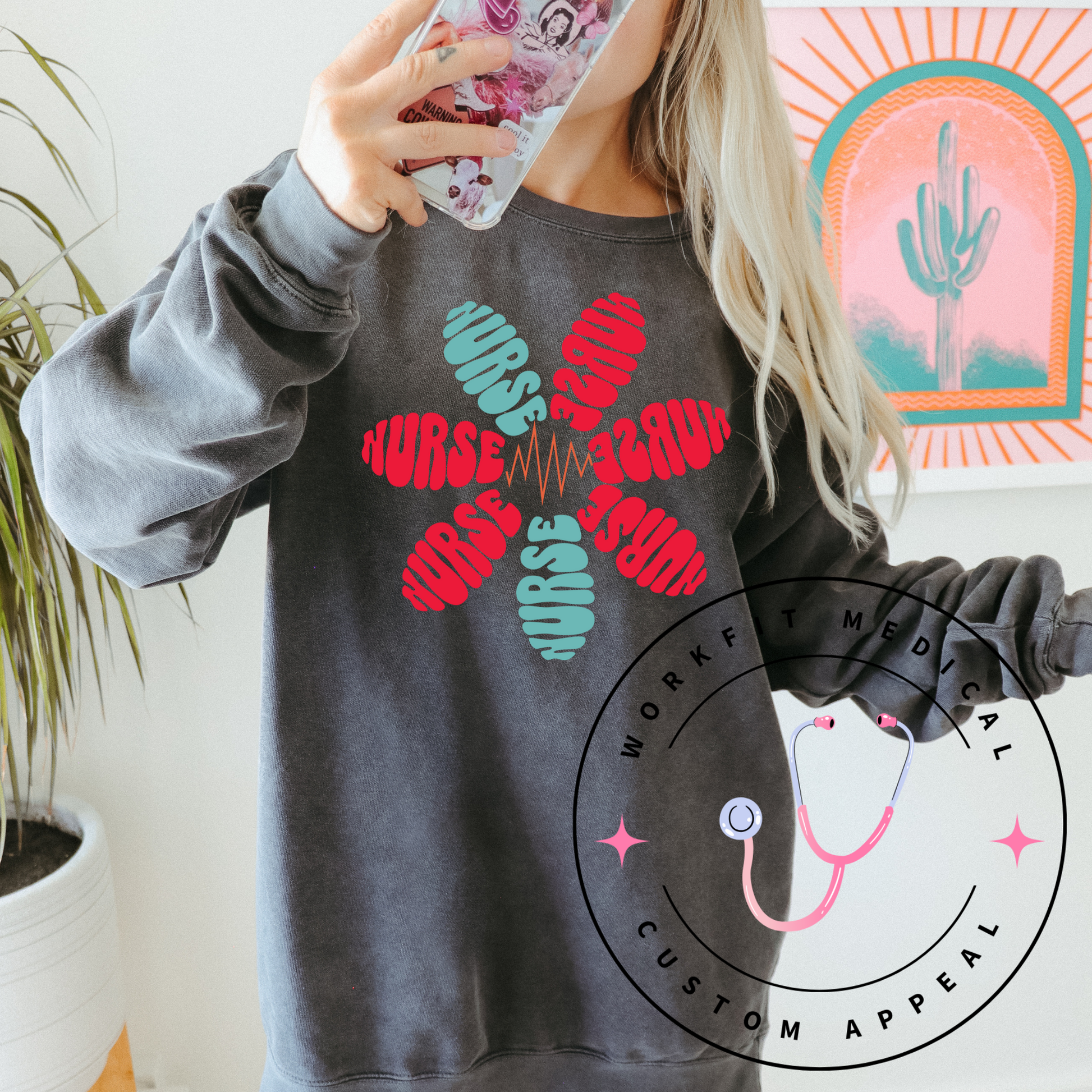 Pepper Comfort Color Crewneck with oversized nurse flower . Designed in house with DTF imagery .