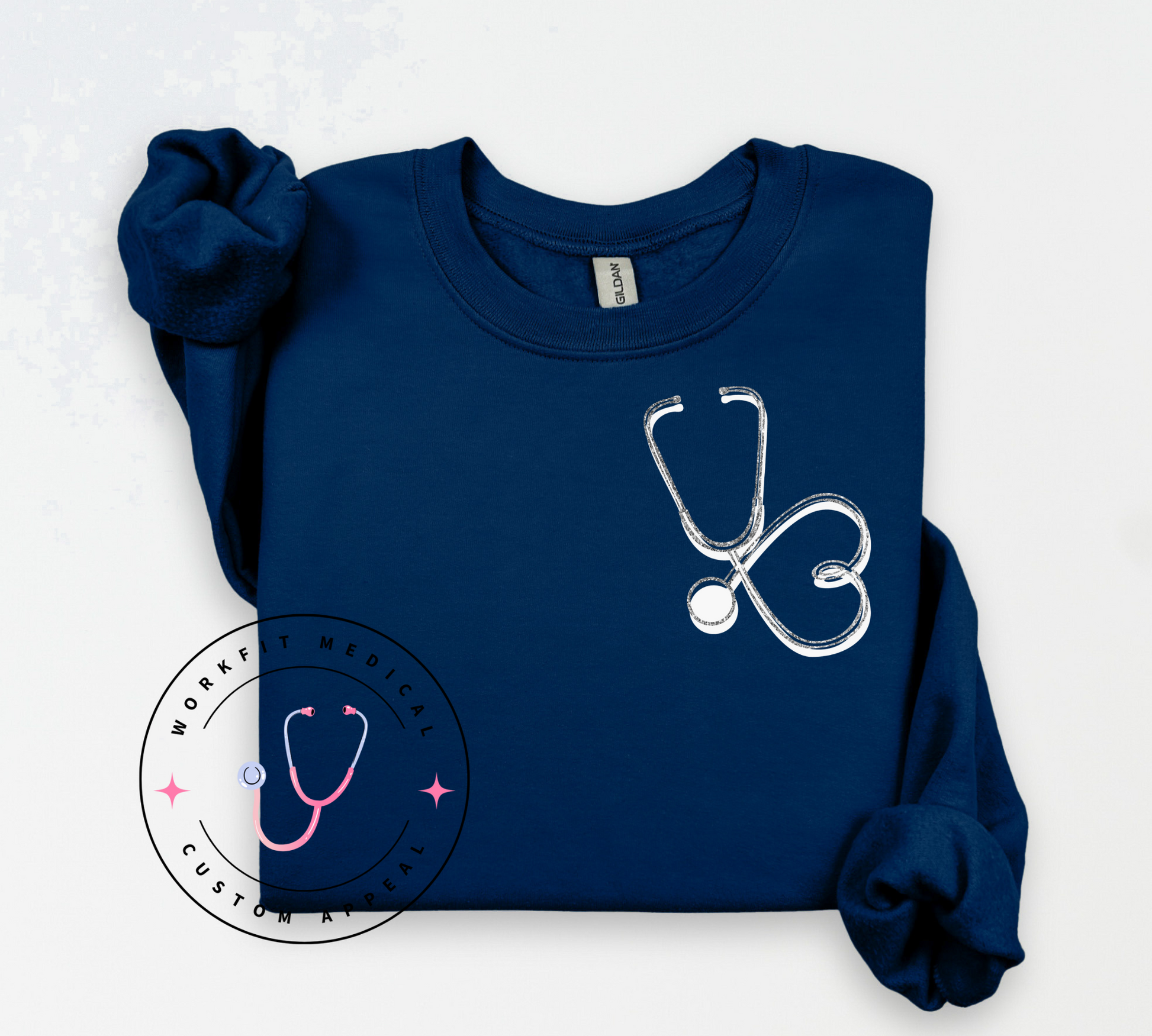 Oversized glitter stethoscope on a Gildan Crew. Gildan crews are 50% Cotton /50% polyester, 13.5oz fleece. It features a double-needle collar, shoulders, and armholes. It also features double-needle cuffs, a banded bottom, set-in sleeves and a quarter-turned body and 1X1 Athletic rib with Lycra®. The Gildan Heavyweight Blend Crew features air jet yarn which means a softer feel and reduced pilling,