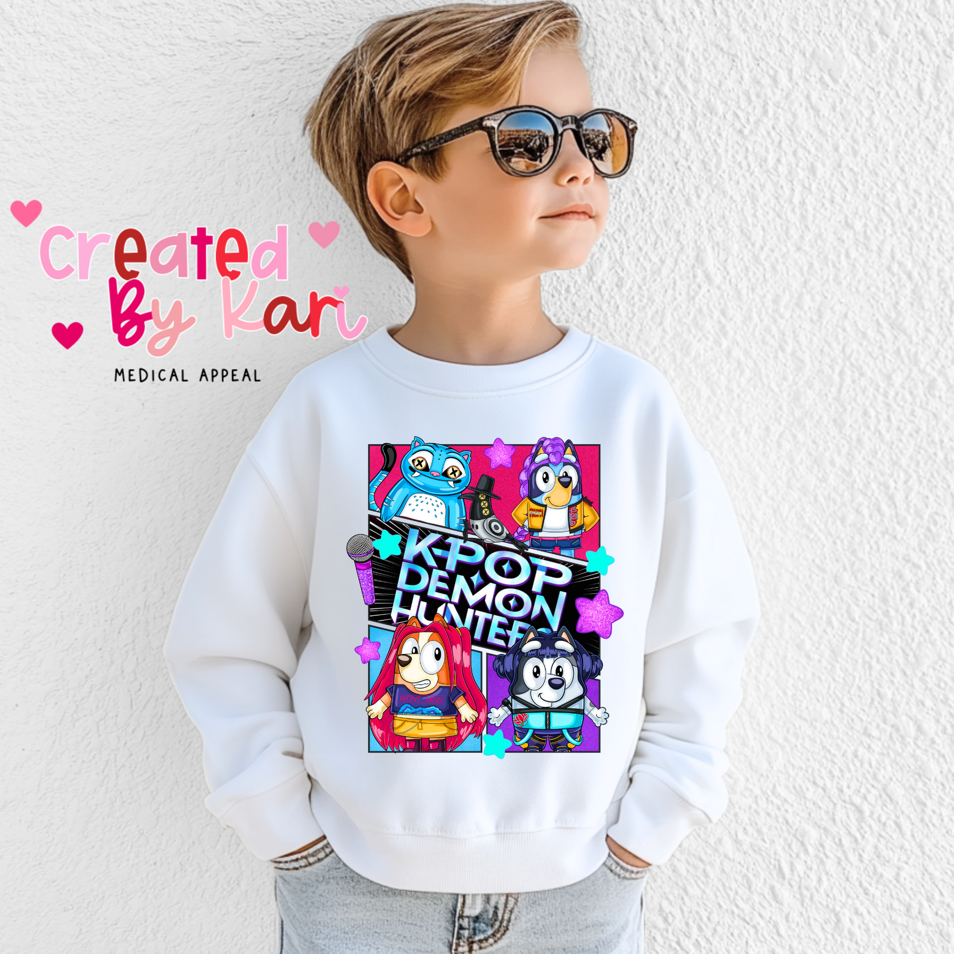 A highly requested Sweater / T Shirt Option. Bluey K POP design- Offered on 2 different color sweaters and a comfort color Pepper Tee. Size Charts below: